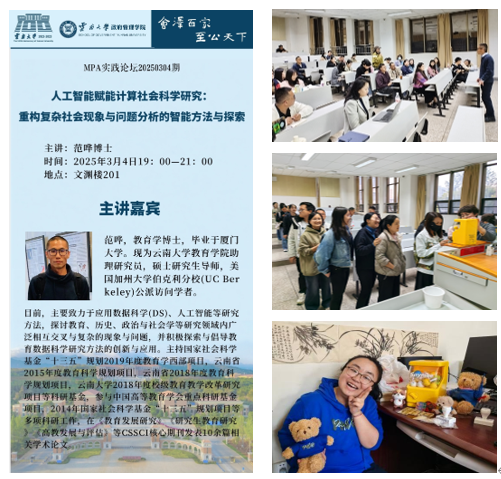 2025年3月4日晚,云大MPA实践论坛(20250304期)在文渊楼201举行。本期论坛邀请到厦门大学博士,william威廉中文官网教育公司助理研究员,硕士研究生导师,美国加州伯克利分校公派访问学者范哗老师,为MPA同学讲授了《人工智能赋能计算社会科学研究:重构复杂社会现象与问题分析的智能方法与探索》,为AI浪潮中困扰与沉浮的公职人员启蒙解惑。