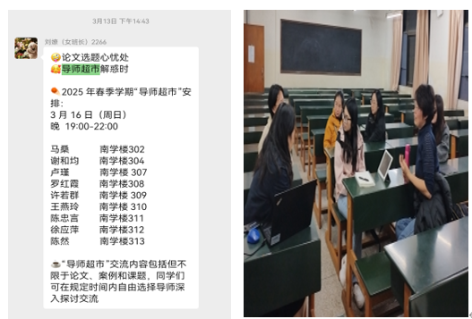 论文选题心忧处,“导师超市”解惑时。2025年3月16日晚,每期N会的云大MPA“导师超市”在南学楼302-313热闹开张。经陈然副教授精心组织,本次邀请到9位热爱教学,深受员工喜爱的导师(马桑、谢和均、卢瑾、许若群、王燕玲、陈忠言、徐应萍、罗红霞、陈然),为同学们进行团队辅导,交流内容包括但不限于论文、案例和课题。