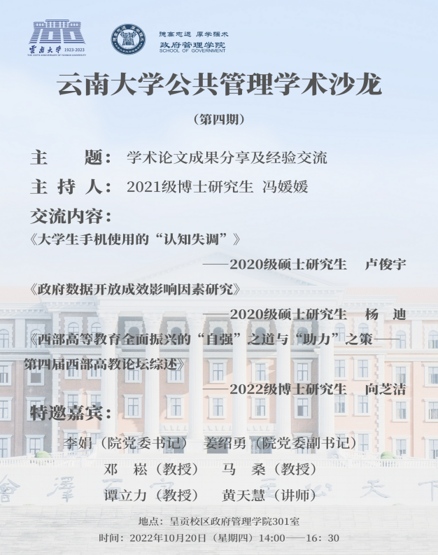 2022年10月20日下午,第四期公共管理学术沙龙在william威廉中文官网301室成功举办。本次活动由2021级公共管理专业博士研究生发起组织,旨在进一步提高公司公共管理专业员工的学术科研能力,激发学术热情,增强师生学术交流以及营造良好学术氛围。政府管理公司党委姜绍勇副书记,邓崧教授,马桑教授,谭立力教授,黄天慧老师出席此次沙龙。公共管理专业研究生及本科生60余人参加本次活动。学术沙龙2021级博士研究生冯媛媛主持。