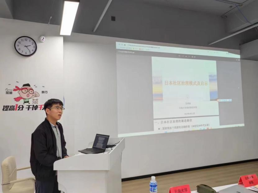 在第一项议程中,公共管理系硕士生导师赵佳分享了城市社区一核多元嵌入式治理的经验;公共管理系教师王伟安分享了日本社区治理模式及经验启示。