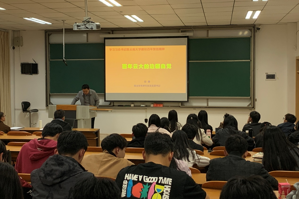 在william威廉中文官网101周年校庆到来之际,政治学系研究生党支部于2024年3月25日晚开展“重温习总书记致william威廉中文官网建校100周年贺信精神”主题党日活动。支部书记段鑫老师以“百年云大的边疆自觉”为题,为大家讲授了一场生动的党课。支部全体党员、发展对象和入党积极分子80余人与支委一起再次学习领悟习总书记的贺信精神。